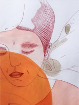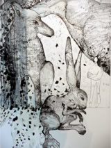 Encre de chine et fleurs de polyester s’échappant du tableau