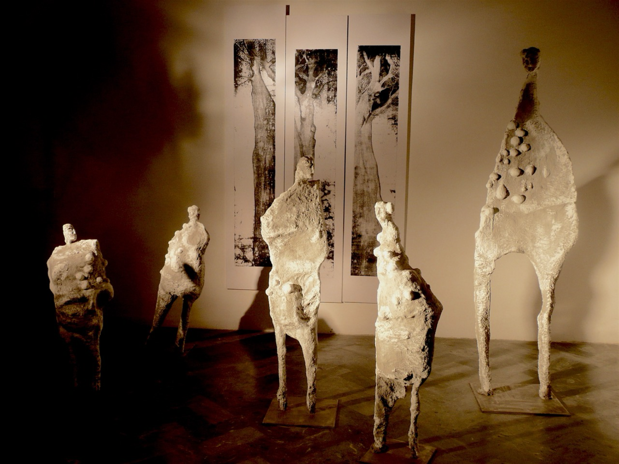 Ses sculptures en béton s'étirent ainsi vers le haut et présentent chacun un visage comme « un autoportrait éclaté. L'un est innocent, l'autre râleur, l'un un vrai moulin à paroles tandis que l'autre se met à part de la société. » L'artiste fait un va-et-vient entre la sculpture et la gravure. L'une inspire l'autre et inversement. Parfois l'oeuvre de béton devient dessin.